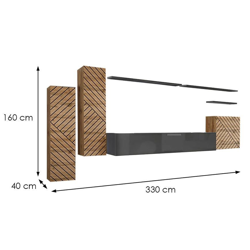Meblościanka Switch to rozwiązanie, które łączy w sobie funkcjonalność, styl i trwałość. Meblościanka z imponującymi wymiarami - 160 cm wysokości, 330 cm szerokości i 40 cm głębokości - zapewnia dużo miejsca do przechowywania, prezentowania dekoracji i tworzenia wyjątkowego wnętrza.
