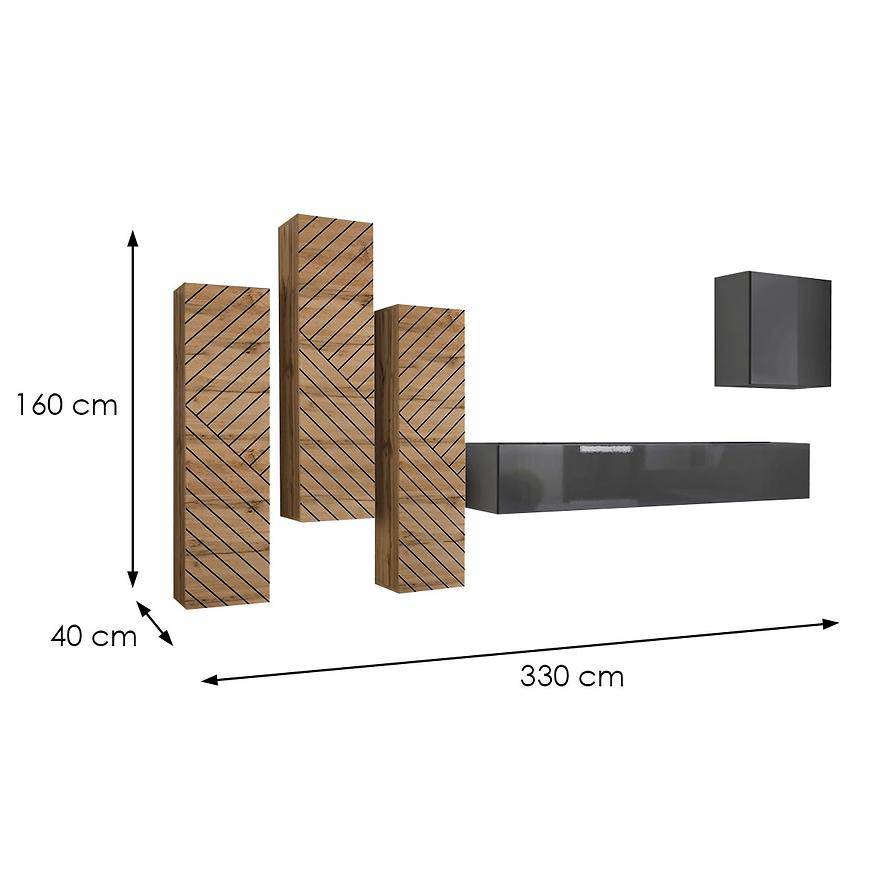 Meblościanka Switch to wyjątkowe rozwiązanie, które łączy funkcjonalność z eleganckim stylem. Z imponującymi wymiarami - 160 cm wysokości, 330 cm szerokości i 40 cm głębokości - zapewnia dużą ilość miejsca do przechowywania, eksponowania dekoracji i tworzenia wyjątkowej przestrzeni.