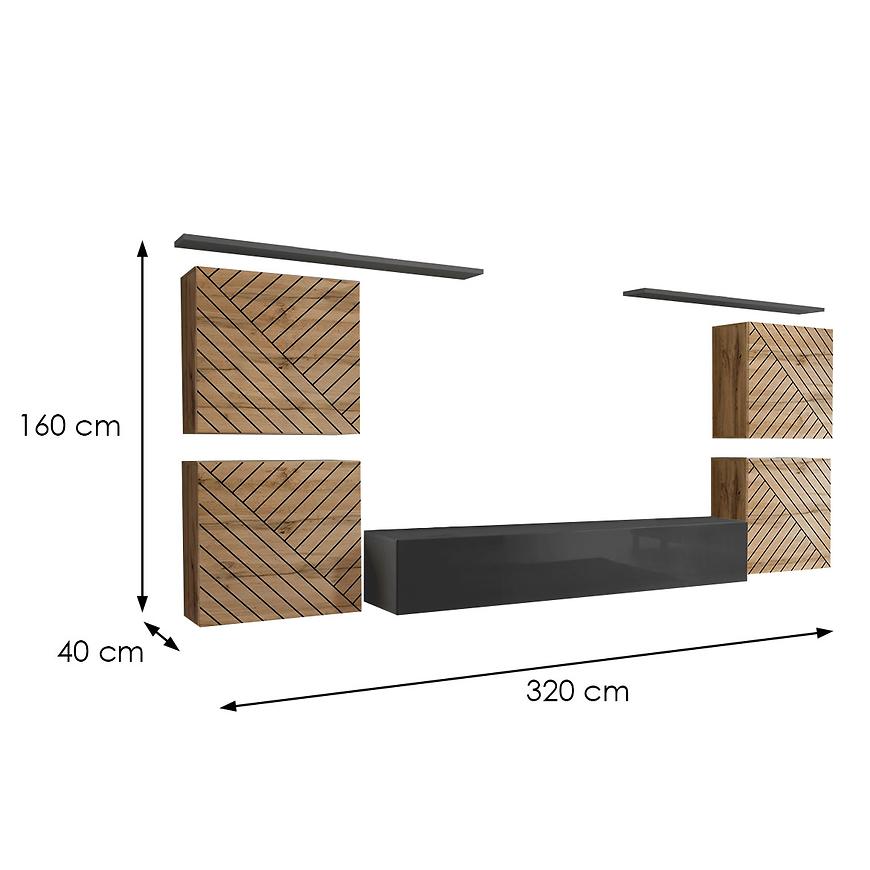 Kolor meblościanki to elegancki drewnopodobny odcień w połączeniu z grafitem, który doskonale komponuje się z różnymi stylami aranżacji wnętrz. Błyszcząco-matowe wykończenie nadaje meblom elegancji i subtelnego wyrazu. Konstrukcja frontów oparta jest na wytrzymałej płycie MDF, co zapewnia trwałość i estetykę. Konstrukcja korpusu z płyty wiórowej laminowanej gwarantuje stabilność i wytrzymałość przez długie lata użytkowania.