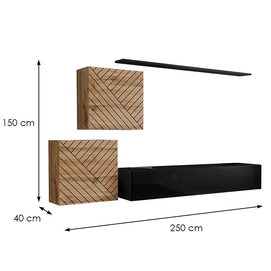 Meblościanka Switch to harmonijne połączenie funkcjonalności i estetyki, idealne rozwiązanie do nowoczesnych wnętrz. Z jej wysokością 150 cm, szerokością 250 cm i głębokością 40 cm wprowadzisz do swojego domu nie tylko praktyczne miejsce do przechowywania, ale także elegancką ozdobę.