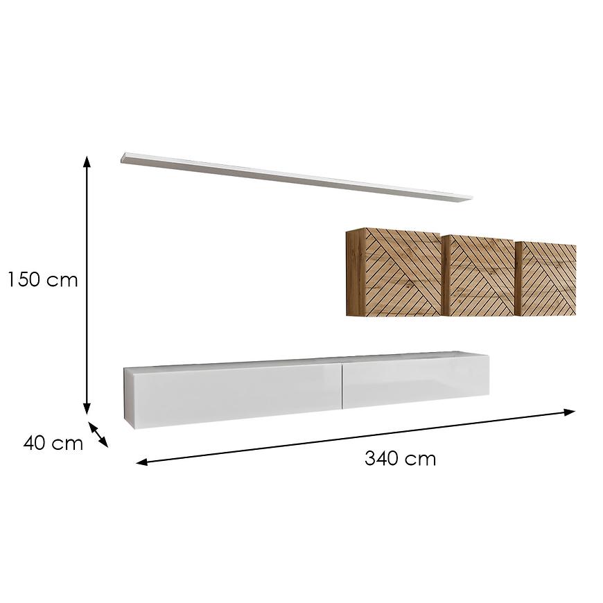 Dąb wotan w połączeniu z bielą nadaje meblościance wyjątkowego charakteru, podkreślając elegancję każdego detalu. Błyszcząco-matowe wykończenie dodaje delikatności, tworząc subtelny efekt świetlny. Konstrukcja frontów oparta jest na solidnej płycie MDF, co zapewnia nie tylko trwałość, ale także wyjątkowy design. Korpus wykonany z płyty wiórowej laminowanej gwarantuje stabilność i długotrwałe użytkowanie.
