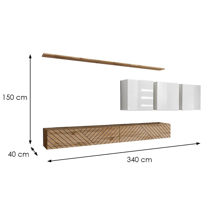 Dąb wotan w połączeniu z bielą nadaje meblościance wyjątkowego charakteru, podkreślając elegancję każdego detalu. Błyszcząco-matowe wykończenie dodaje delikatności, tworząc subtelny efekt świetlny. Konstrukcja frontów oparta jest na solidnej płycie MDF, co zapewnia nie tylko trwałość, ale także wyjątkowy design. Korpus wykonany z płyty wiórowej laminowanej gwarantuje stabilność i długotrwałe użytkowanie.