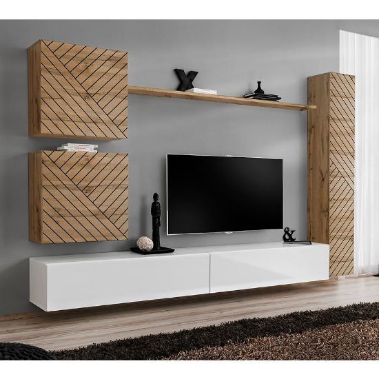 Meblościanka Switch to nie tylko praktyczne miejsce do przechowywania, ale także element dekoracyjny, który wnosi do wnętrza nowoczesny styl. W skład meblościanki wchodzą dwie szafki zamykane drzwiczkami, jedna otwarta półka wisząca, jednodrzwiowa podwieszana witryna oraz podwieszana komoda służąca jako szafka RTV. To kompleksowe rozwiązanie do przechowywania sprzętu multimedialnego, książek i ozdób.