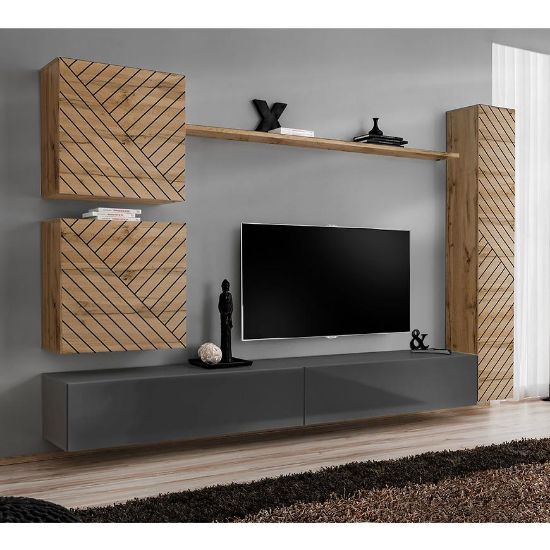 Meblościanka Switch to nie tylko praktyczne miejsce do przechowywania, ale także element dekoracyjny, który wnosi do wnętrza nowoczesny styl. W skład meblościanki wchodzą dwie szafki zamykane drzwiczkami, jedna otwarta półka wisząca, jednodrzwiowa podwieszana witryna oraz podwieszana komoda służąca jako szafka RTV. To kompleksowe rozwiązanie do przechowywania sprzętu multimedialnego, książek i ozdób.
