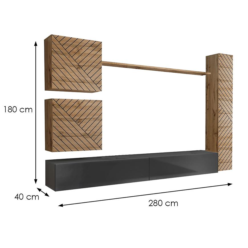 Meblościanka Switch to esencja nowoczesnego designu, doskonale wpisująca się w trendy aranżacyjne. Z imponującą wysokością 180 cm, szerokością 280 cm i głębokością 40 cm, meblościanka stanowi doskonałe rozwiązanie do przemyślanej organizacji przestrzeni w Twoim wnętrzu.