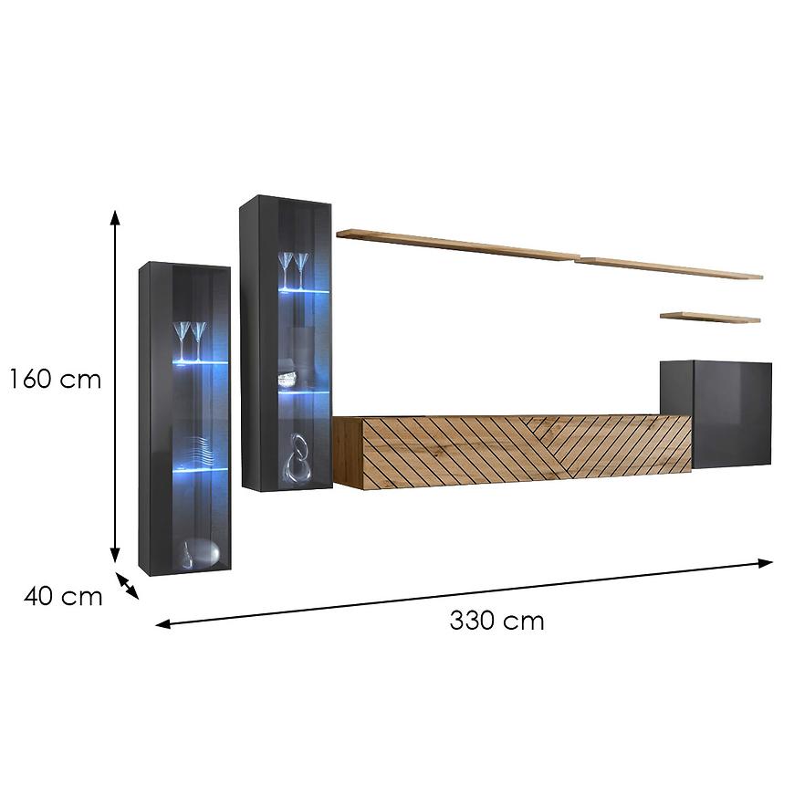 Kolor dąb wotan w połączeniu z grafitem nadaje meblościance Switch wyjątkowego charakteru, dodając elegancji i szlachetności. Błyszcząco-matowe wykończenie sprawia, że meblościanka prezentuje się niezwykle nowocześnie i atrakcyjnie, jednocześnie łagodząc intensywność koloru.