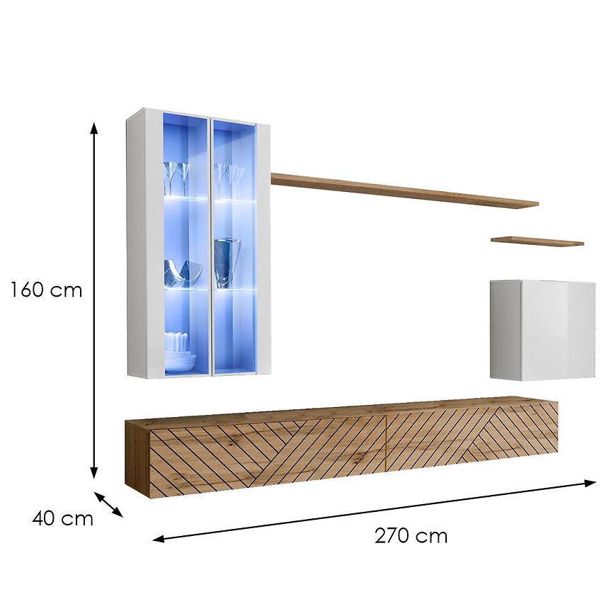 Kolor dąb wotan w połączeniu z bielą oraz błyszcząco-matowe wykończenie sprawia, że meblościanka prezentuje się niezwykle nowocześnie i elegancko.