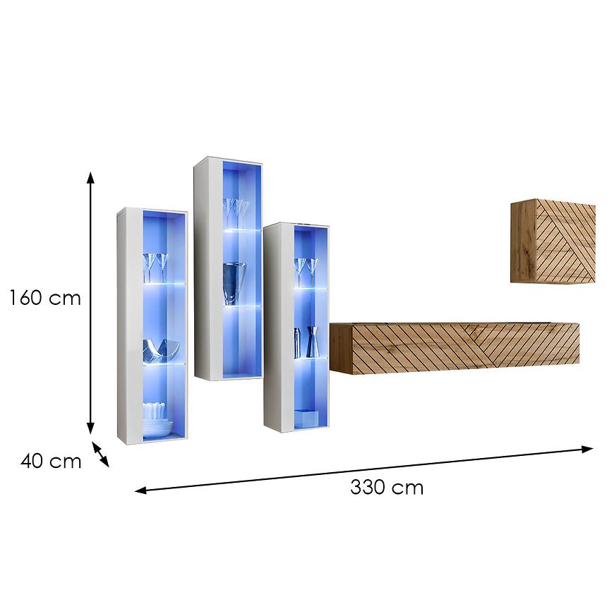 Kolor frontów i korpusu utrzymany jest w eleganckim odcieniu dąb wotan w połączeniu z bielą, nadaje meblościance wyjątkowego charakteru, podkreślając jej uniwersalność i ponadczasowy design. Błyszcząco-matowe wykończenie dodaje meblościance nowoczesności, jednocześnie łagodząc intensywność koloru.