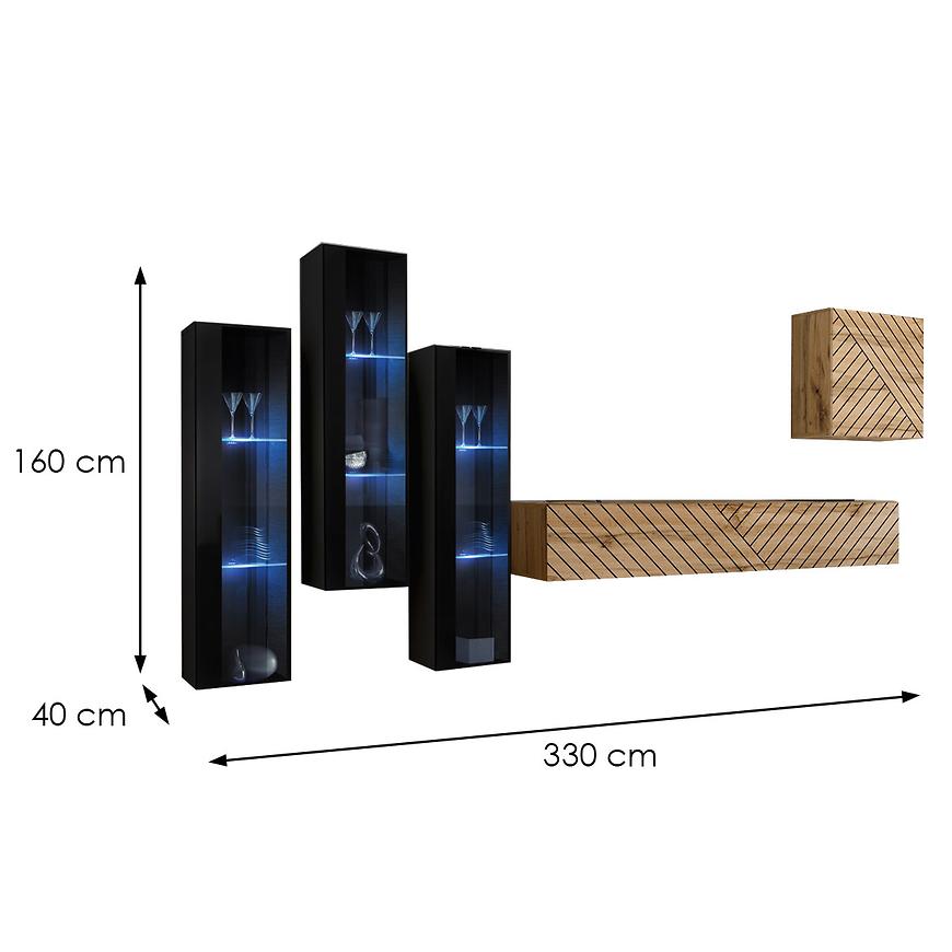 Kolor frontów i korpusu utrzymany jest w eleganckim odcieniu dąb wotan w połączeniu z czernią, nadaje meblościance wyjątkowego charakteru, podkreślając jej uniwersalność i ponadczasowy design. Błyszcząco-matowe wykończenie dodaje meblościance nowoczesności, jednocześnie łagodząc intensywność koloru.