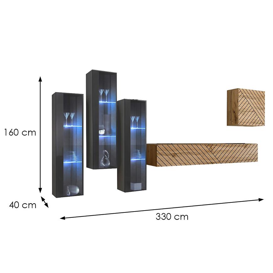 Kolor frontów i korpusu utrzymany jest w eleganckim odcieniu dąb wotan w połączeniu z grafitem, nadaje meblościance wyjątkowego charakteru, podkreślając jej uniwersalność i ponadczasowy design. Błyszcząco-matowe wykończenie dodaje meblościance nowoczesności, jednocześnie łagodząc intensywność koloru.