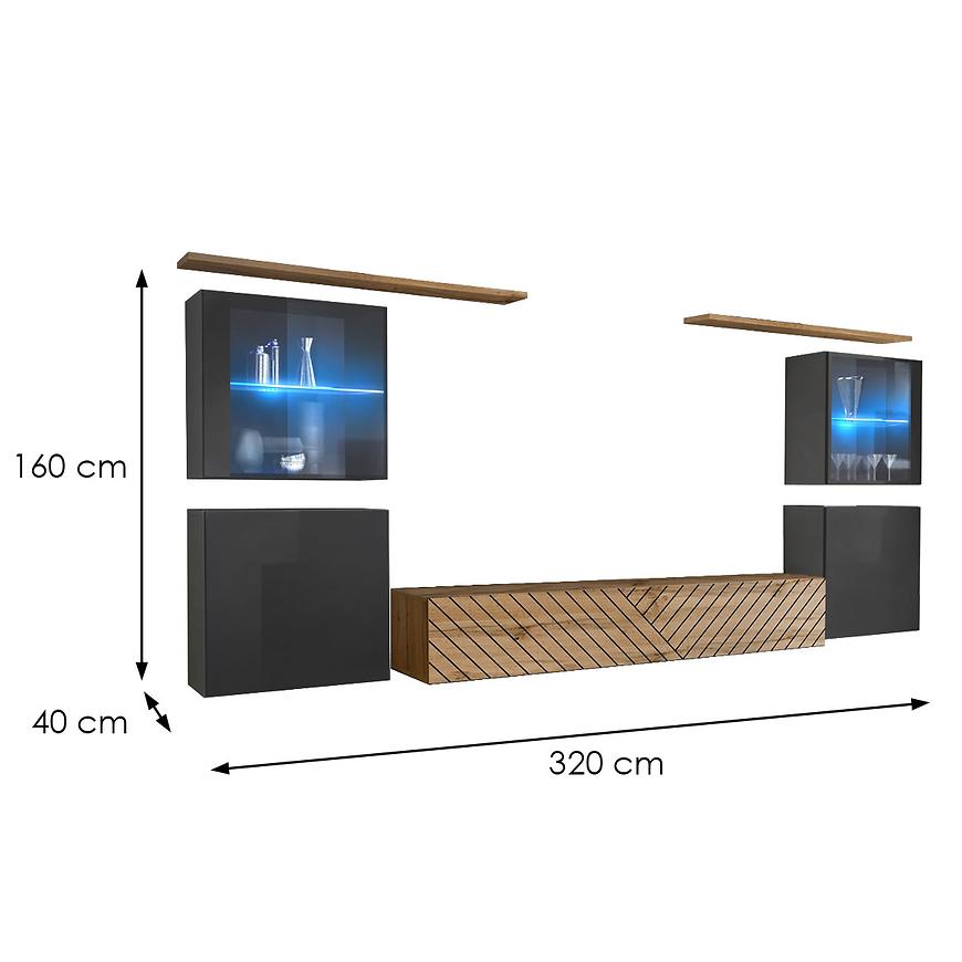 Kolor frontów i korpusu utrzymany jest w eleganckim odcieniu dąb wotan w połączeniu z grafitem, nadaje meblościance wyjątkowego charakteru, podkreślając jej uniwersalność i ponadczasowy design. Błyszcząco-matowe wykończenie dodaje meblościance nowoczesności, jednocześnie łagodząc intensywność koloru.