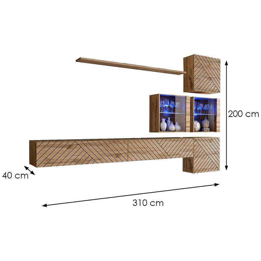 Meblościanka przykuwa uwagę, stając się centralnym punktem salonu. Jej wymiary sprawiają, że meblościanka doskonale wpasowuje się w różnorodne wnętrza, dodając im stylu i elegancji.