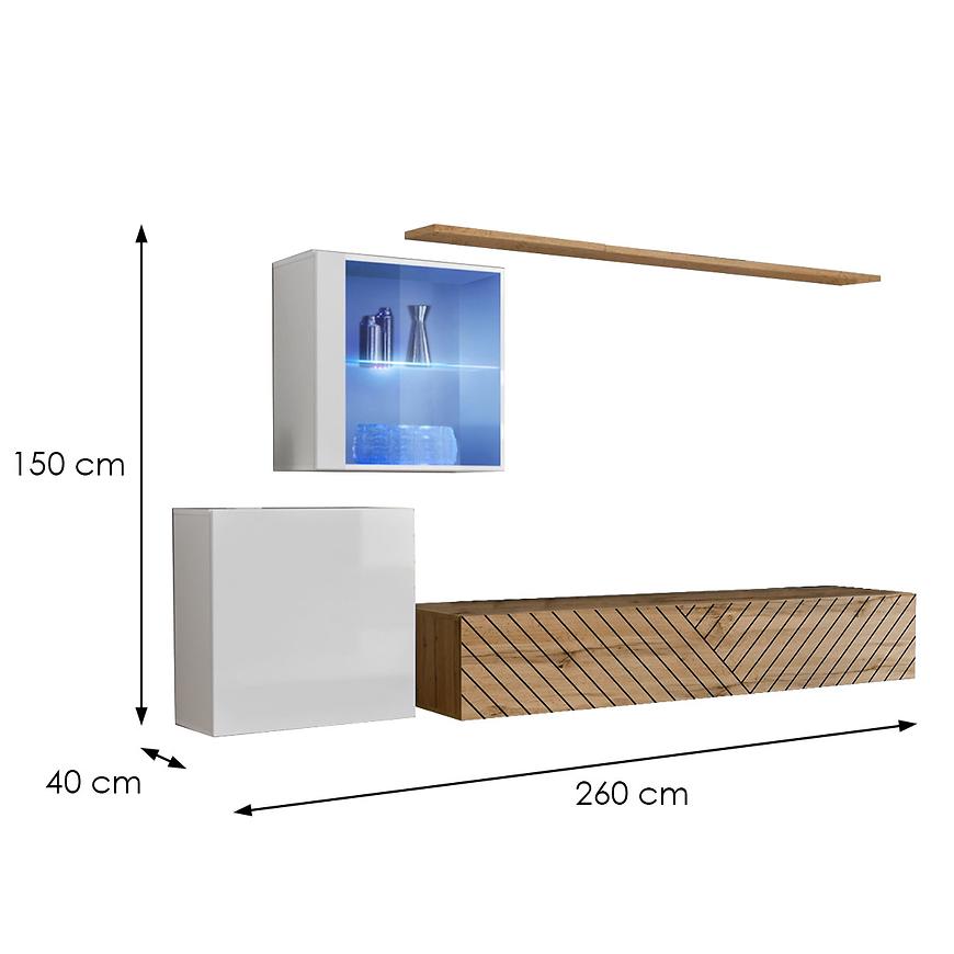 Meblościanka idealnie wpisuje się w różne aranżacje wnętrz, nadając pomieszczeniu przytulny i elegancki charakter. Jej wymiary sprawiają, że z łatwością dopasujesz ją do wielu przestrzeni, i efektywnie wykorzystasz dostępną przestrzeń, nawet w mniejszych pomieszczeniach.