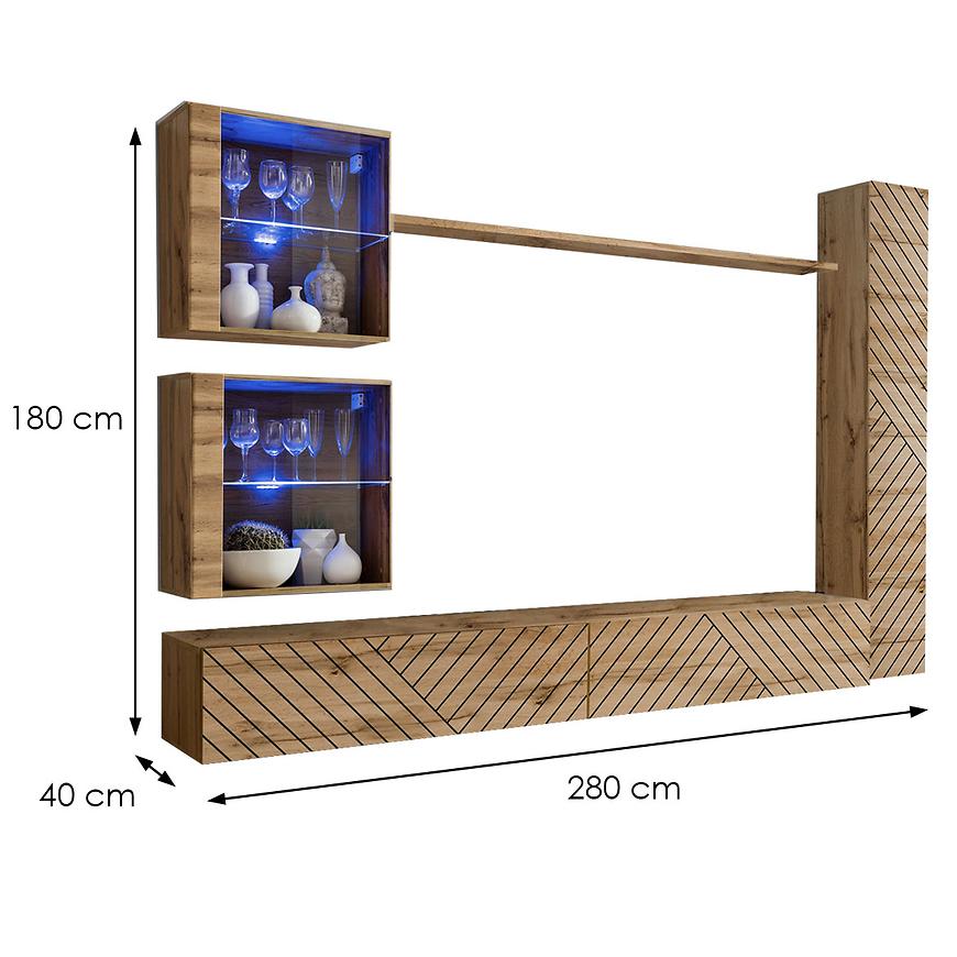 Meblościanka przykuwa uwagę, stając się centralnym punktem salonu. Jej wymiary sprawiają, że meblościanka doskonale wpasowuje się w różnorodne wnętrza, dodając im stylu i elegancji.