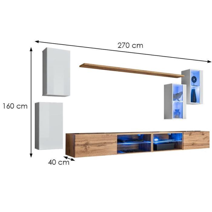 Zestaw ma 270 cm szerokości, 160 cm wysokości i 40 cm głębokości, zapewniając przestrzeń do przechowywania sprzętu RTV, książek, dekoracji i innych drobiazgów codziennego użytku, przy kompaktowych wymiarach odpowiednich do mniejszych salonów.