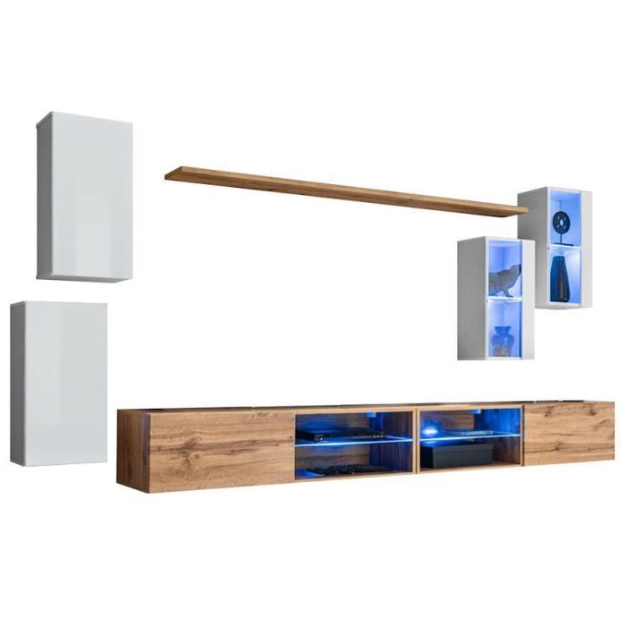 Meblościanka Switch XXV Biały/Wotan to nowoczesny, elegancki i funkcjonalny zestaw do salonu, który łączy kompaktową zabudowę z kontrastowym wykończeniem frontów oraz wbudowanym oświetleniem LED, tworząc centralny punkt aranżacji wnętrza.