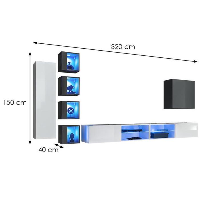 Zestaw ma 320 cm szerokości, 150 cm wysokości i 40 cm głębokości, oferując dużą przestrzeń do przechowywania sprzętu RTV, książek, dekoracji i innych elementów codziennego użytku.