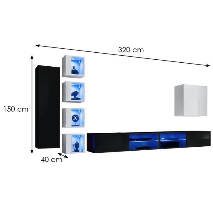 Zestaw ma 320 cm szerokości, 150 cm wysokości i 40 cm głębokości, oferując dużą przestrzeń do przechowywania sprzętu RTV, książek, dekoracji i innych drobiazgów codziennego użytku.