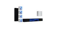 Meblościanka posiada wbudowane oświetlenie LED, które subtelnie podkreśla fronty i tworzy przyjemną atmosferę w salonie. LED uwydatnia kontrast między czarnymi a białymi frontami, tworząc designerski efekt wizualny i nowoczesny klimat wnętrza.