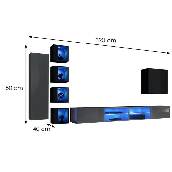 Zestaw ma 320 cm szerokości, 150 cm wysokości i 40 cm głębokości, co pozwala wygodnie ustawić sprzęt RTV, książki, dekoracje oraz inne drobiazgi, zachowując porządek w salonie.