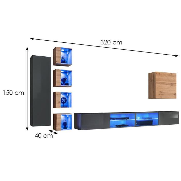 Zestaw ma 320 cm szerokości, 150 cm wysokości i 40 cm głębokości, co pozwala wygodnie ustawić sprzęt RTV, książki, dekoracje i inne drobiazgi, zachowując porządek w salonie.