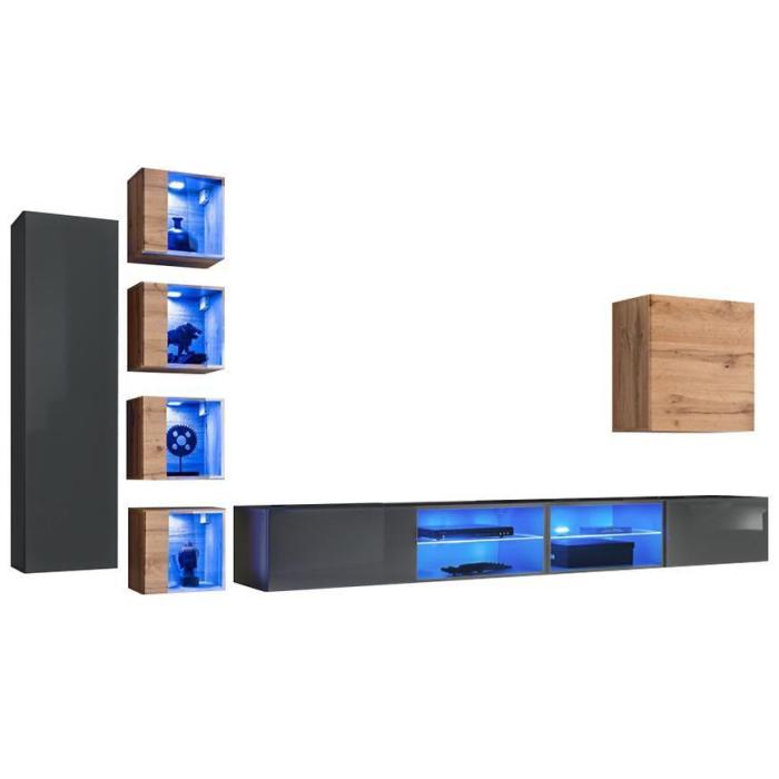 Meblościanka posiada wbudowane oświetlenie LED, które subtelnie podkreśla fronty i dodaje przyjemnej atmosfery w salonie. LED uwydatnia kontrast między grafitowymi i Wotan frontami, tworząc designerski efekt wizualny.