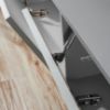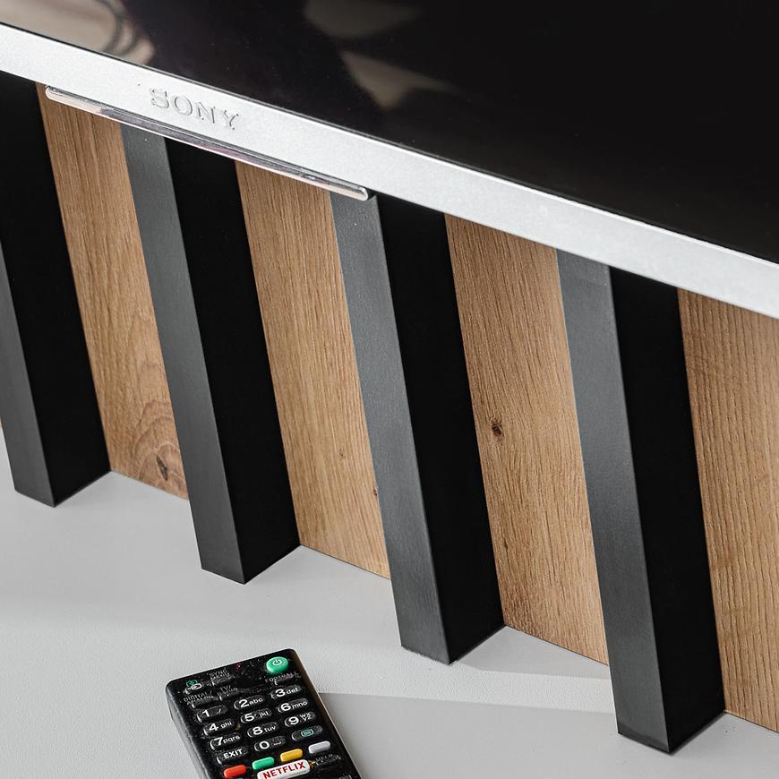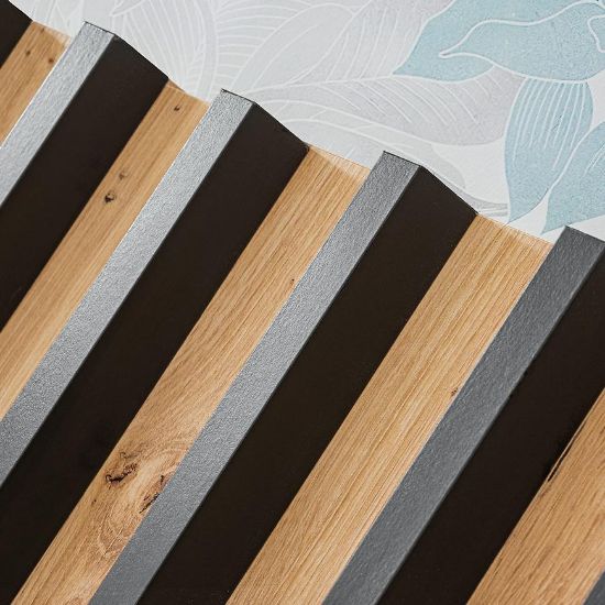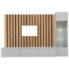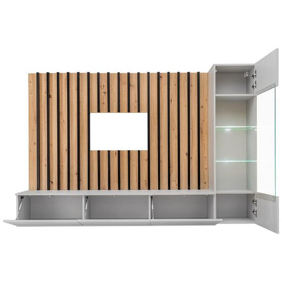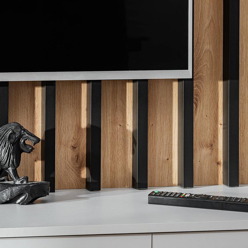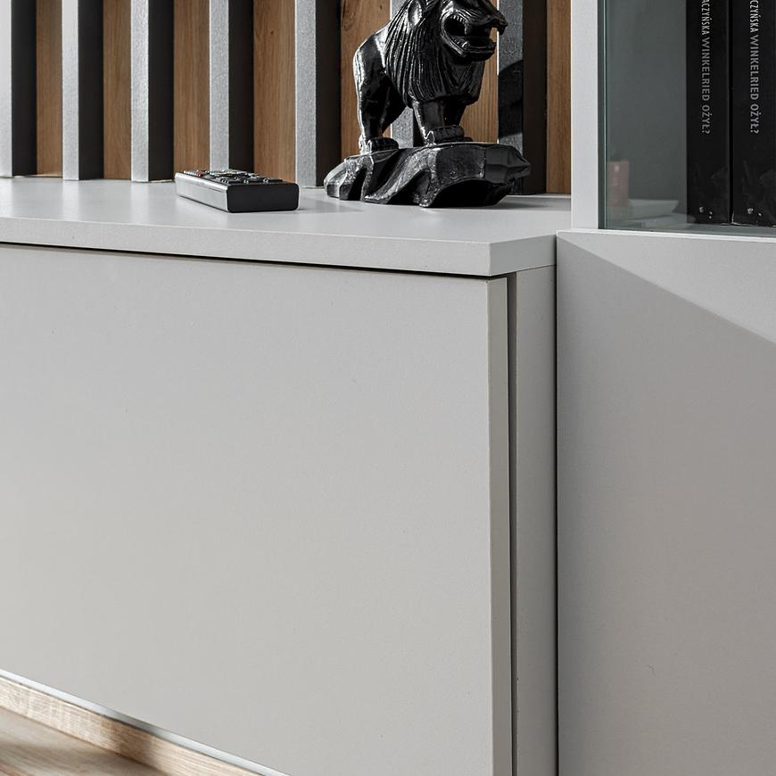 Kolor perła grey nadaje meblościance elegancki, nowoczesny wygląd, który doskonale wpasuje się w różne aranżacje wnętrz. Fronty oraz korpus meblościanki są wykończone na matowo, co dodaje meblowi subtelnego uroku. Konstrukcja frontów i korpusu oparta jest na solidnej płycie wiórowej laminowanej, co gwarantuje trwałość i odporność na uszkodzenia. Dodatkowym atutem tej meblościanki jest lamelowa ścianka w kolorze dąb artisan z czarnymi elementami, nadająca meblowi wyjątkowy charakter.