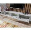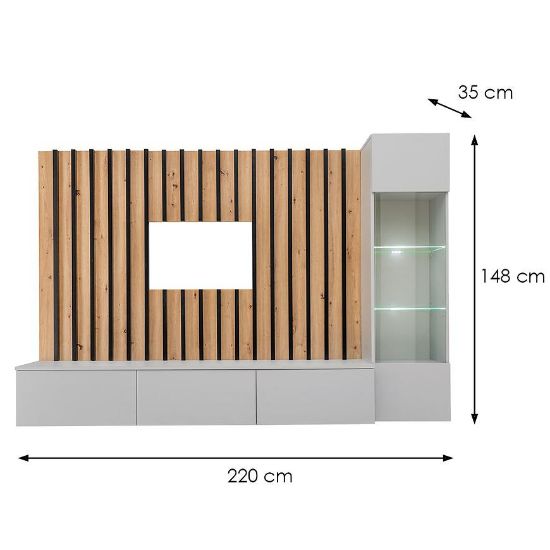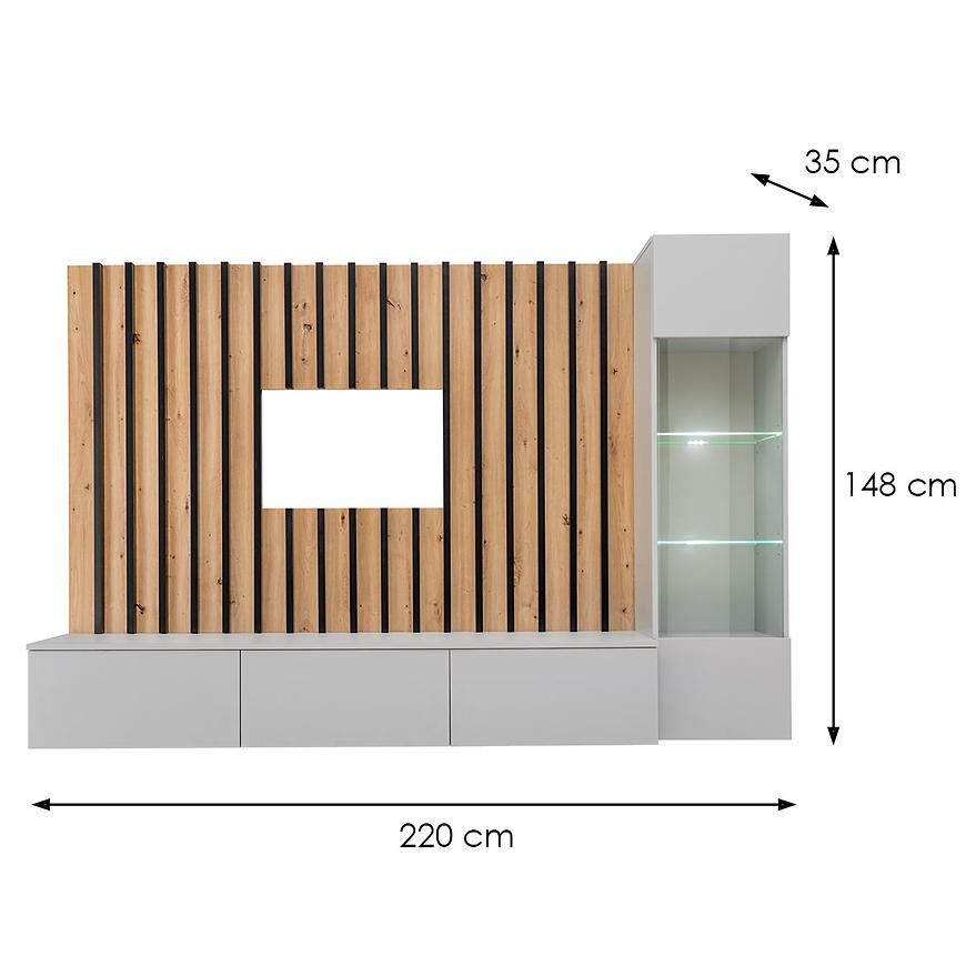 Meblościanka Verti wyróżnia się swoimi wymiarami, osiągając wysokość 148 cm, szerokość 220 cm i głębokość 35 cm, co zapewnia wystarczająco dużo miejsca do przechowywania i wyświetlania Twoich ulubionych przedmiotów.