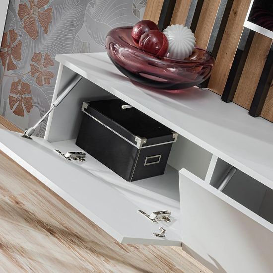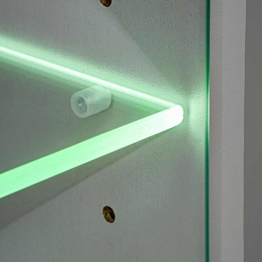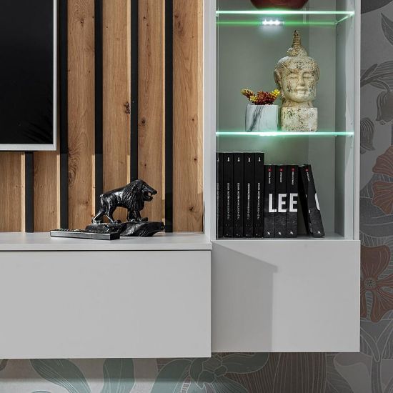Warto również zaznaczyć, że meblościanka Verti jest wyposażona w oświetlenie LED w standardzie, które nadaje wnętrzu przytulnego nastroju i podkreśla piękno Twoich eksponowanych przedmiotów.