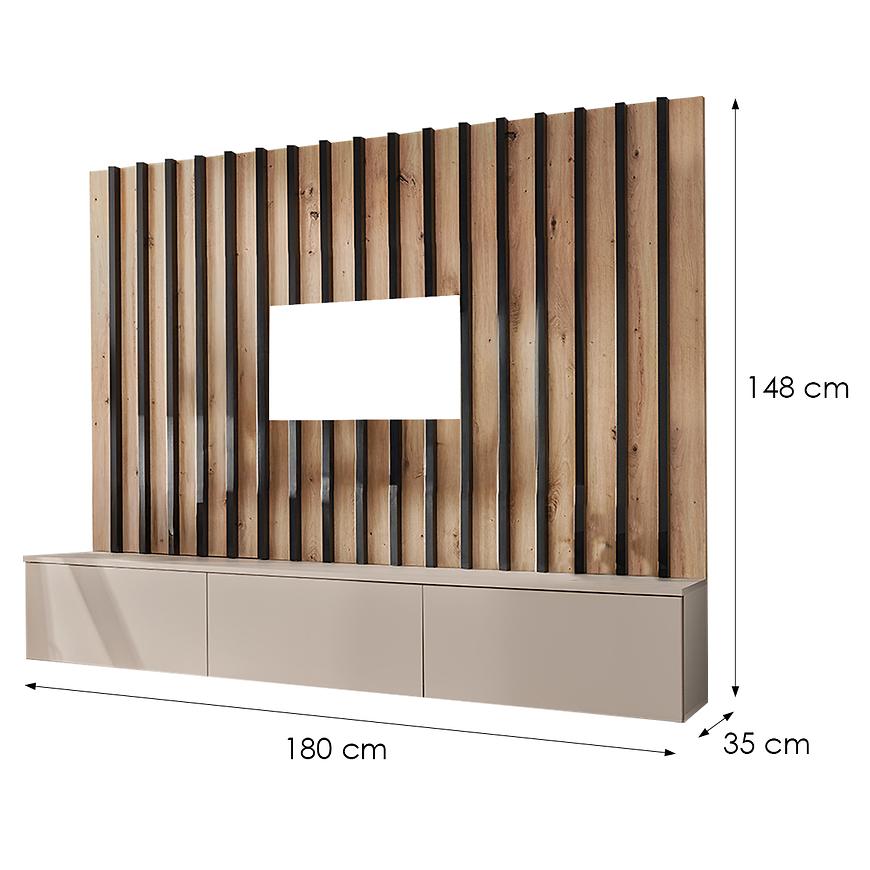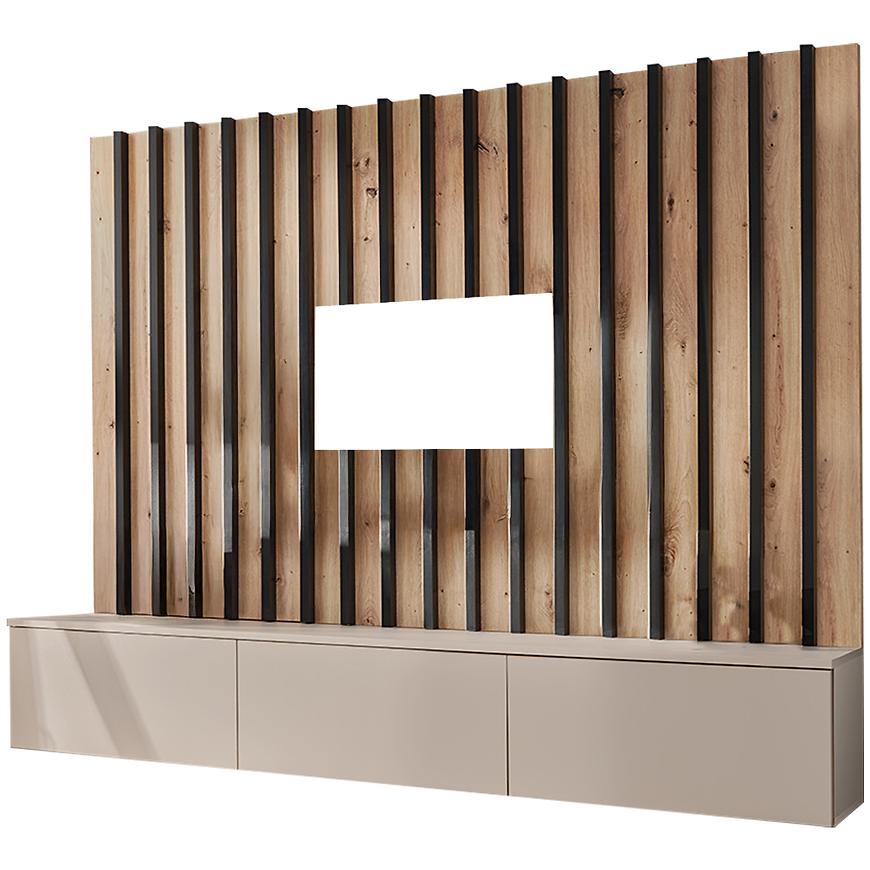 Meblościanka Verti II CAS VT 2 to nowoczesna i kompaktowa propozycja do salonu, która łączy w sobie estetykę i funkcjonalność. Zestawienie dekoru kaszmiru, dębu artisan i czerni nadaje całości eleganckiego, ale przytulnego charakteru. Matowe wykończenie oraz wisząca konstrukcja dodają lekkości i nowoczesnego wyglądu, a jednocześnie zapewniają wygodną przestrzeń do przechowywania i ekspozycji. To doskonały wybór do mniejszych i średnich salonów, w których liczy się styl, porządek i komfort codziennego użytkowania.