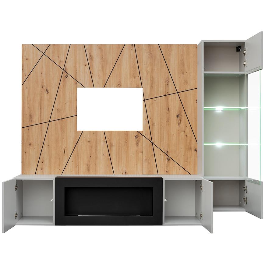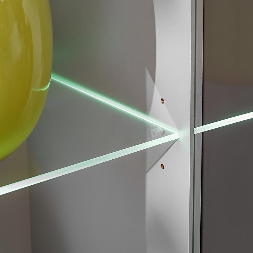Fronty i korpusy wykończone są w macie, co nadaje całości subtelnej, nowoczesnej estetyki. Dzięki solidnemu wykonaniu z laminowanej płyty wiórowej meblościanka cechuje się trwałością i łatwością w pielęgnacji. W zestawie znajduje się oświetlenie LED w standardzie, które podkreśla bryłę mebla i dodaje wnętrzu nastrojowego klimatu.
