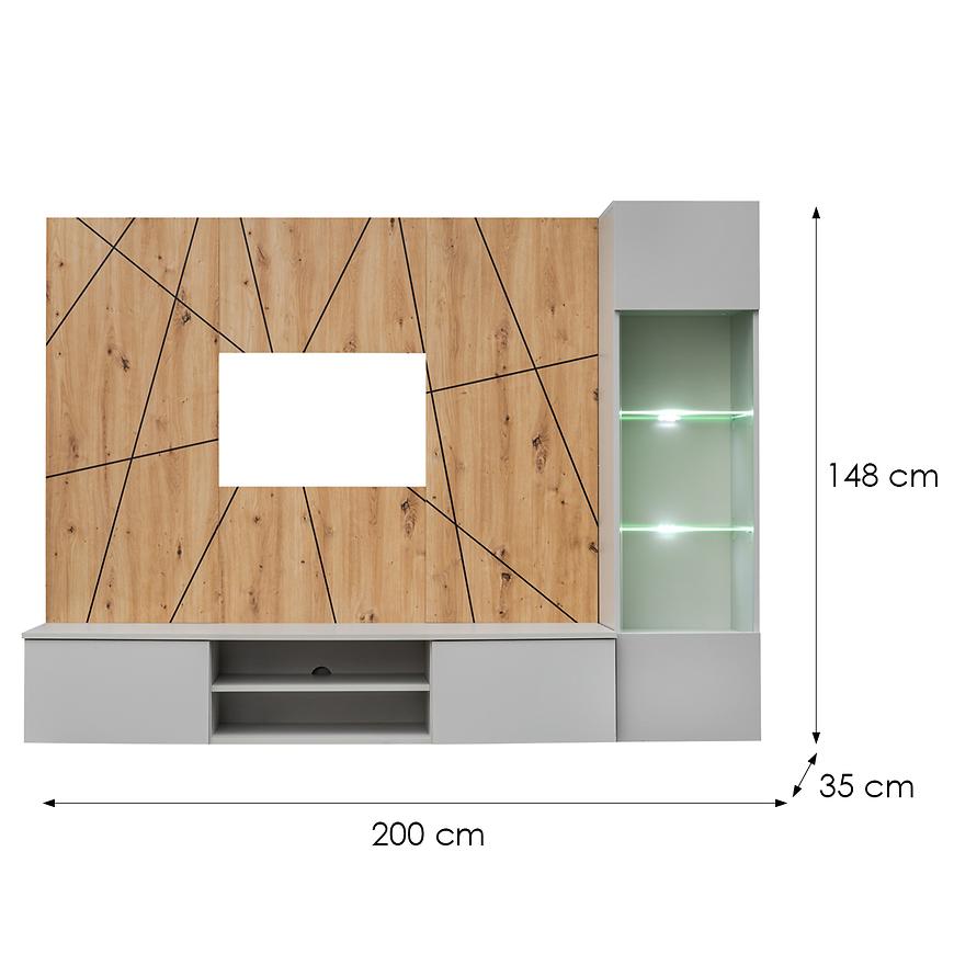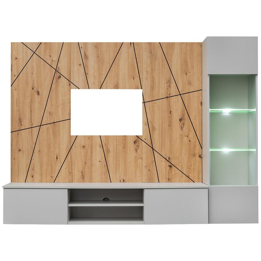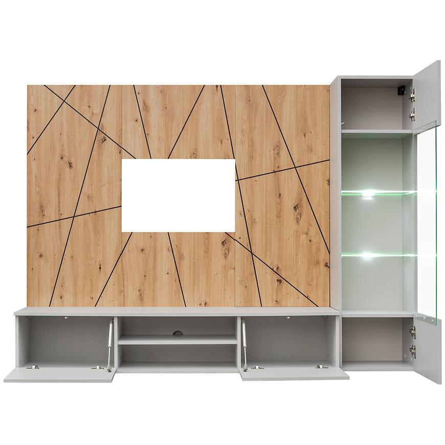 Meblościanka Xari PGAS XR G w kolorze Perla Gray/Artisan to elegancka i funkcjonalna propozycja do salonu, która łączy nowoczesną formę z ciepłem drewnianych akcentów. Matowe fronty w połączeniu z elementami czerni oraz wybarwieniem artisan tworzą modną i spójną całość, która świetnie wpisuje się w aktualne trendy aranżacyjne.