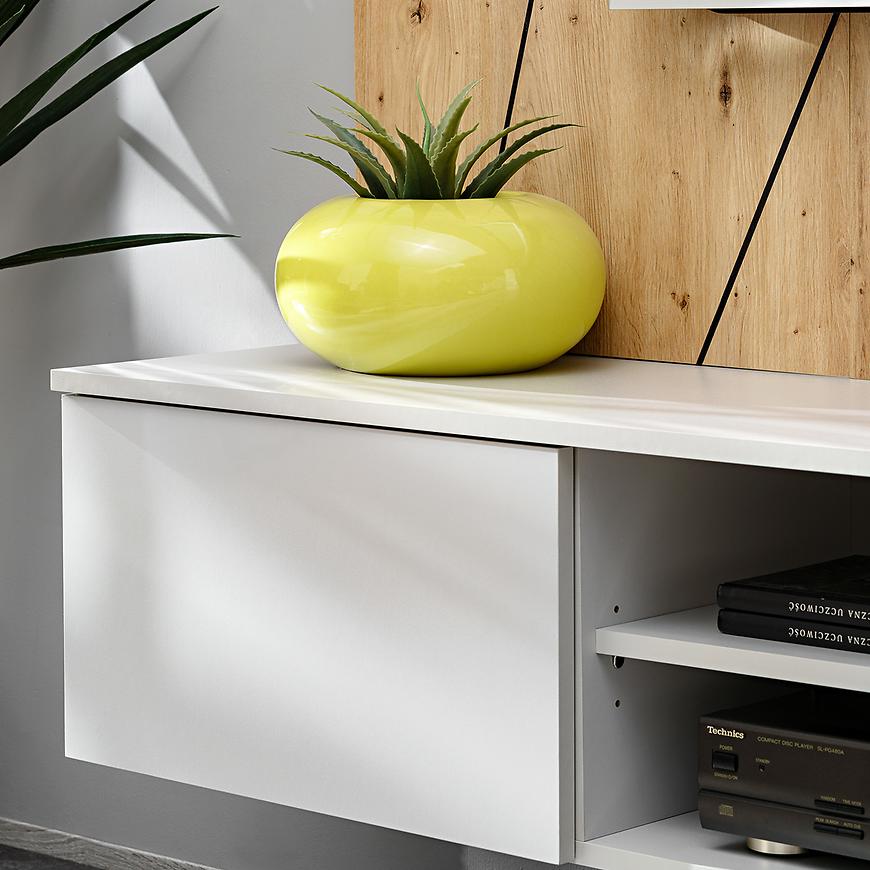Dzięki kompaktowym wymiarom i wiszącej konstrukcji meblościanka idealnie sprawdzi się zarówno w większych, jak i bardziej kameralnych przestrzeniach dziennych. Wbudowane oświetlenie LED podkreśla estetykę mebla, tworząc przyjemny nastrój w pomieszczeniu. To praktyczne i stylowe rozwiązanie dla osób, które szukają minimalistycznego, ale efektownego wyposażenia salonu.