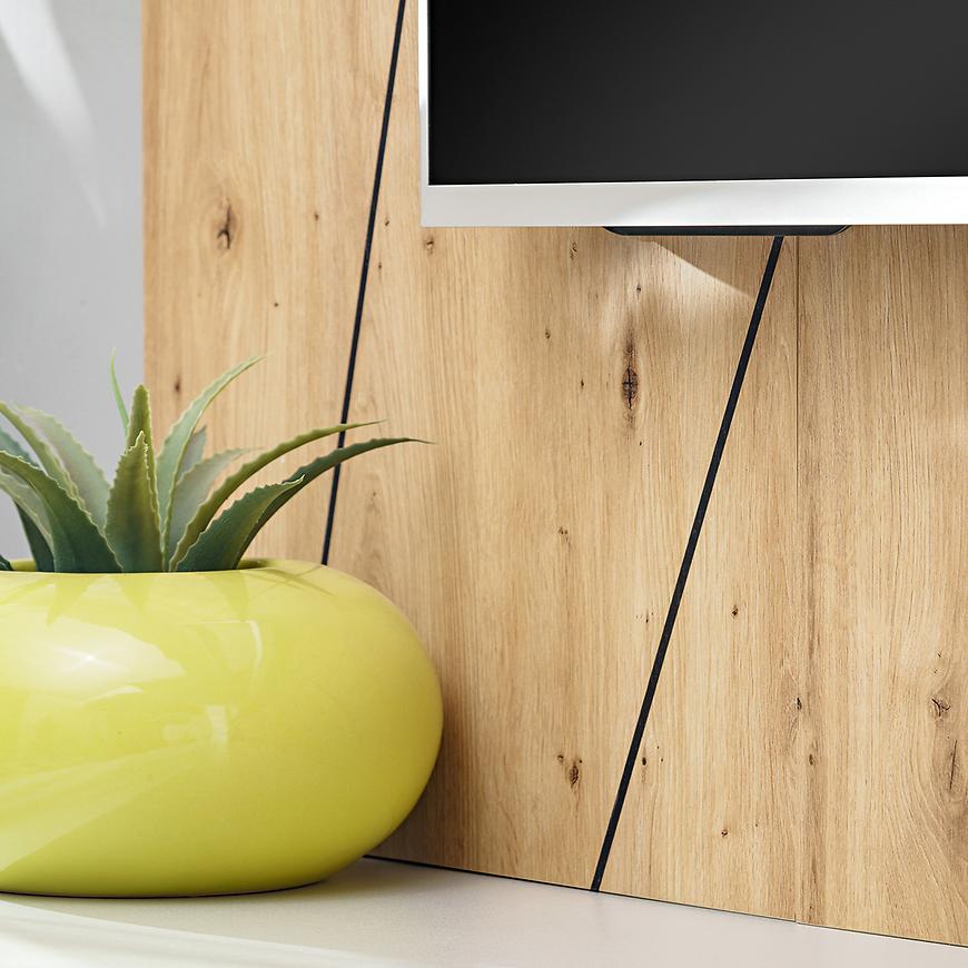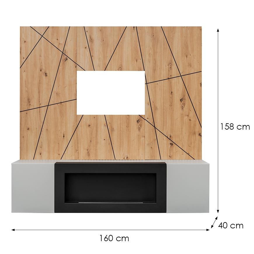 Jej wymiary (wysokość 158 cm, szerokość 160 cm, głębokość 40 cm) sprawiają, że jest idealna do pomieszczeń o różnych rozmiarach, zapewniając jednocześnie odpowiednią przestrzeń do przechowywania i ekspozycji dekoracji czy sprzętu RTV. Meblościanka jest wąska i wisząca, co pomaga zaoszczędzić miejsce na podłodze, a jednocześnie nadaje wnętrzu lekkości i nowoczesnego charakteru.