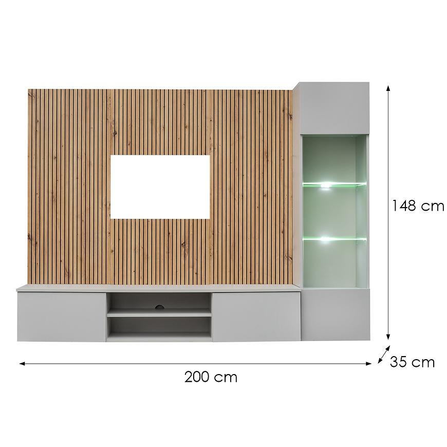 Meblościanka Xari PGAS XR L w wybarwieniu Perla Gray/Artisan to propozycja stworzona z myślą o nowoczesnym salonie. Połączenie stonowanej szarości, ciepłego dekoru artisan i akcentów w kolorze czarnym nadaje wnętrzu elegancki, a zarazem przytulny charakter. Matowe wykończenia podkreślają nowoczesny styl mebla, a solidna konstrukcja z laminowanej płyty wiórowej gwarantuje trwałość i komfort użytkowania.
