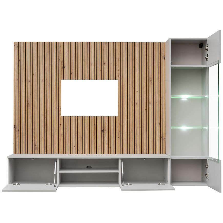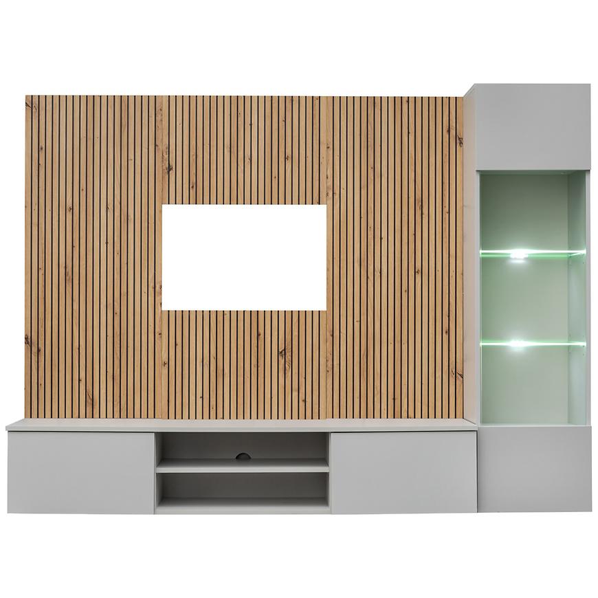 Wbudowane oświetlenie LED, dostępne w standardzie, tworzy nastrojowe tło dla codziennego relaksu, dodając całości nowoczesnego wyrazu. Wąska forma meblościanki pozwala zaoszczędzić miejsce, jednocześnie oferując praktyczne rozwiązania do przechowywania. Meblościanka Xari to doskonały wybór do salonu, w którym liczy się styl, funkcjonalność i nowoczesna estetyka.
