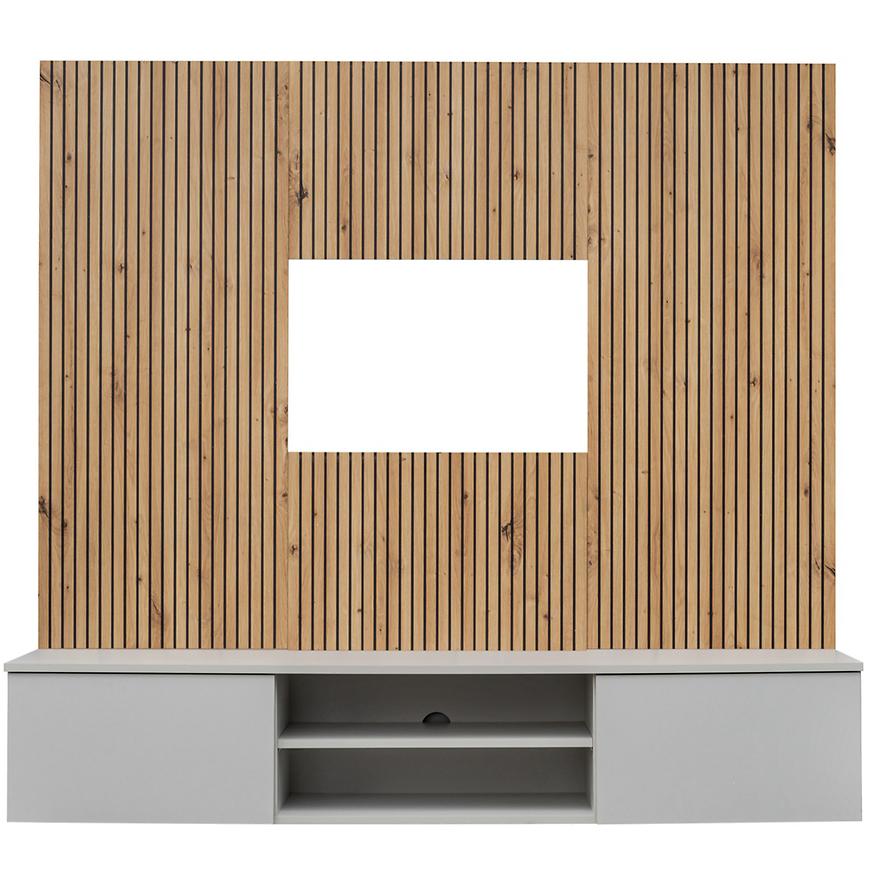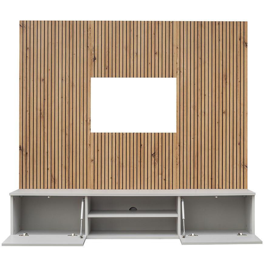 Meblościanka Xari PGAS XR L2 w kolorze Perla Gray/Artisan to kompaktowe i stylowe rozwiązanie idealne do nowoczesnego salonu. Połączenie szarej perły z dekorem artisan oraz subtelnymi czarnymi akcentami tworzy elegancką i przytulną całość, która świetnie wkomponuje się w wiele aranżacji wnętrz.