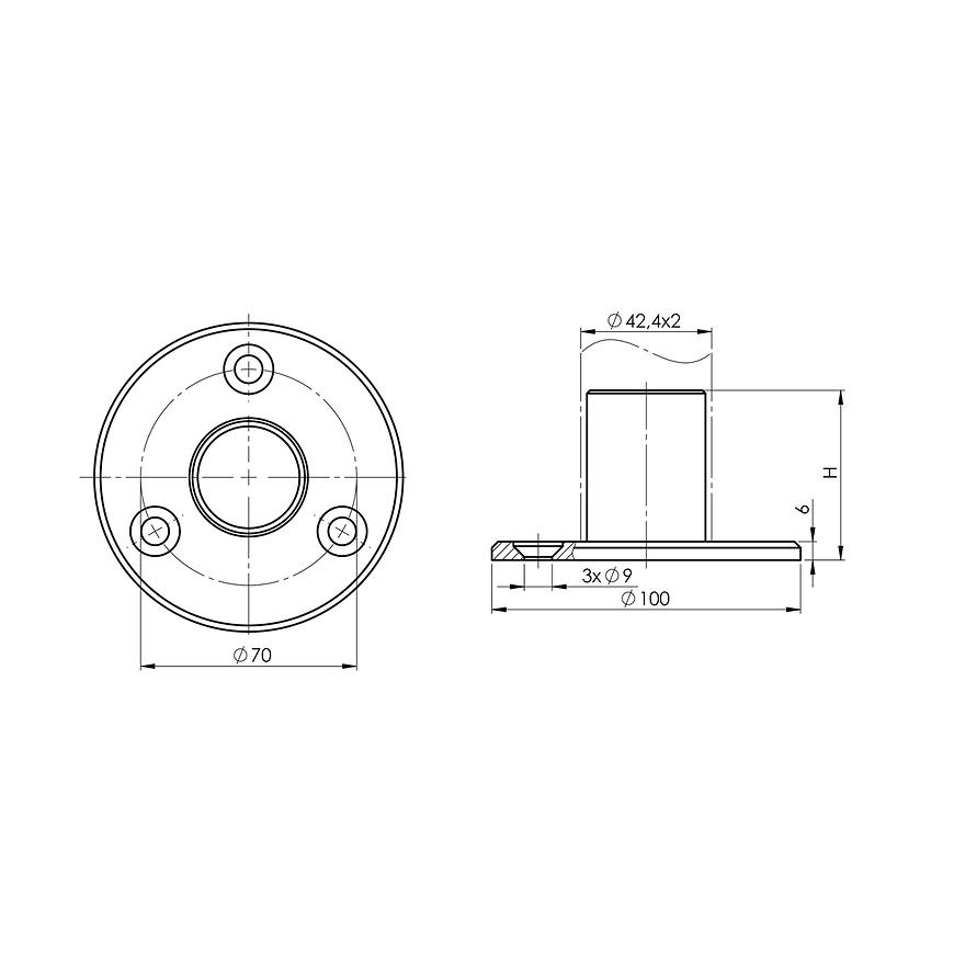 Mocowanie przeznaczone jest dla słupka Ø42,4 x 2,0 mm, a średnica krążka wynosi Ø100 mm. Wysokość kołnierza to 44 mm, a jego grubość 6 mm. Element posiada 3 otwory montażowe Ø10,5 mm, co zapewnia stabilny i bezpieczny montaż.