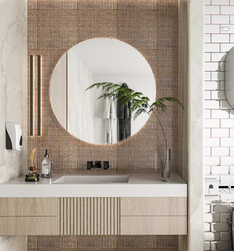 Małe moduły mozaiki układają się w regularny rytm, tworząc nowoczesną, elegancką strukturę. To doskonały sposób na podkreślenie strefy umywalkowej, wnęki, ramki lustra lub fragmentu ściany, który ma przyciągać uwagę. Subtelne elementy nadają przestrzeni głębi i charakteru.