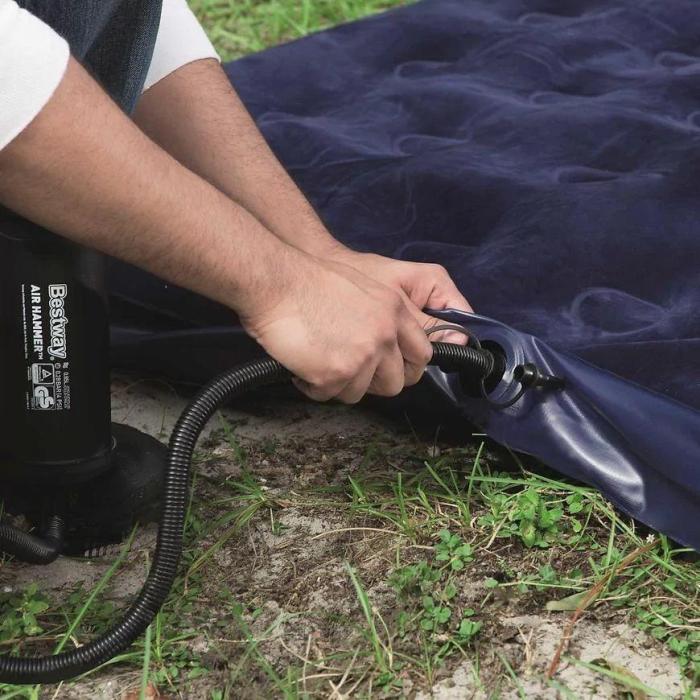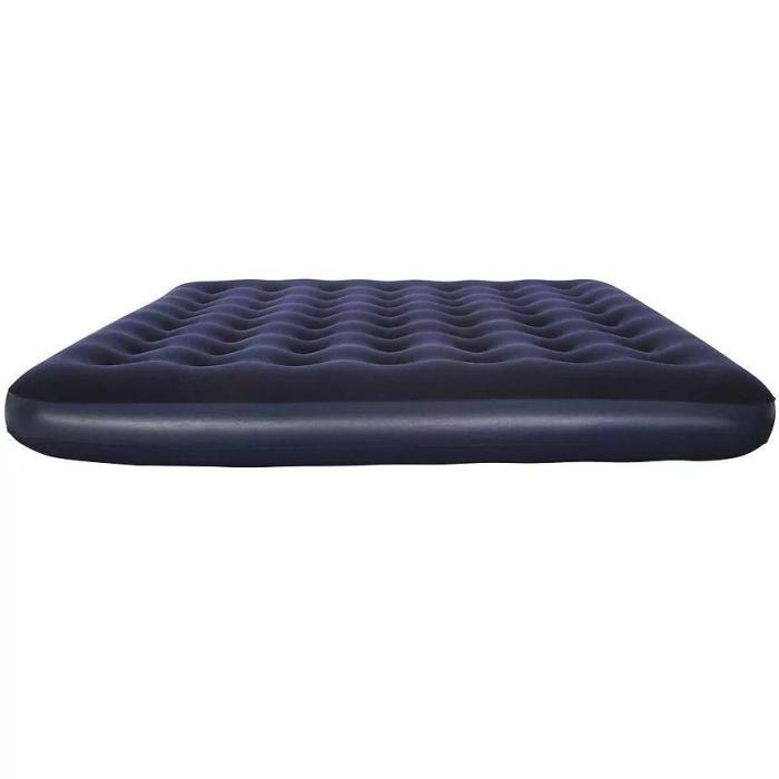 Materac nadmuchiwany dwuosobowy o wymiarach 203x183x22, wykonany z wytrzymałego testowanego vinylu w kolorze niebieskim. Flokowana powierzchnia materaca zapewnia większą wygodę użytkowania. Konstrukcja coil-beam gwarantuje trwałość i komfort podczas leżenia zarówno w domu jak i podczas wyjazdów. W zestawie jest także łatka naprawcza.