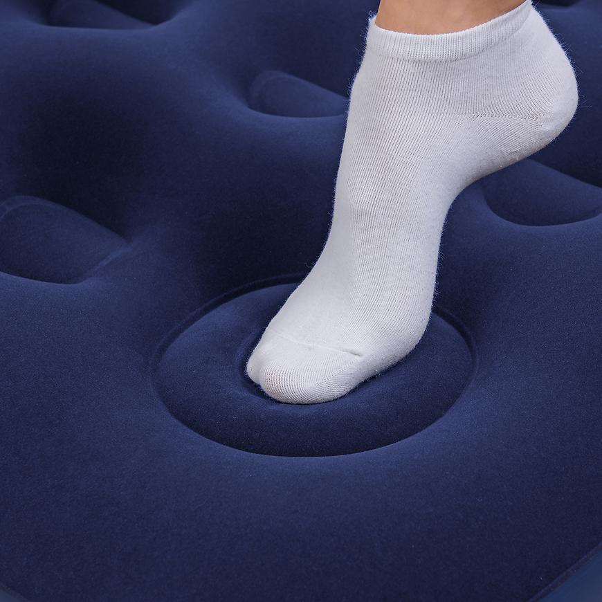 Instalacja materaca jest prosta i szybka, dzięki wbudowanej pompie nożnej. Bez konieczności podłączania do gniazdka, możesz go łatwo napompować zarówno podczas wyjazdów, jak i w domu. Duży, dwudrożny zawór szybkiego spuszczania pozwala na błyskawiczne i łatwe opróżnienie materaca. Po komfortowej nocy po prostu zwolnij zawór, a powietrze z materaca szybko opuści go na twoich oczach.