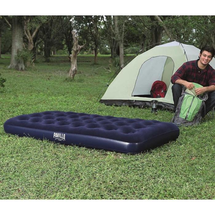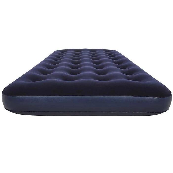 Materac nadmuchowany dwuosobowy o wymiarach 188x99x22cm, wykonany z wytrzymałego testowanego vinylu w kolorze niebieskim. Flokowana powierzchnia materaca zapewnia większą wygodę użytkowania. Konstrukcja coil-beam gwarantuje trwałość i komfort podczas leżenia zarówno w domu jak i podczas wyjazdów. W zestawie jest także łatka naprawcza.