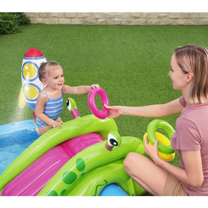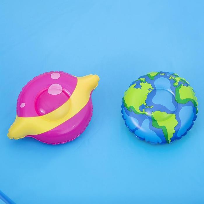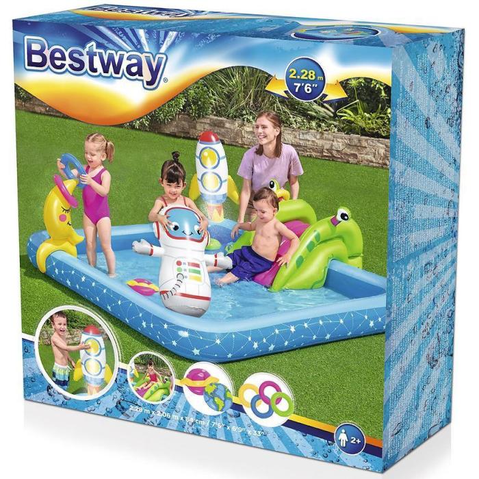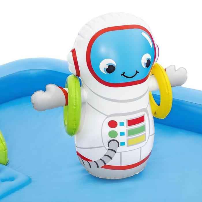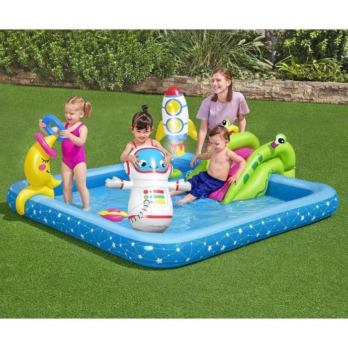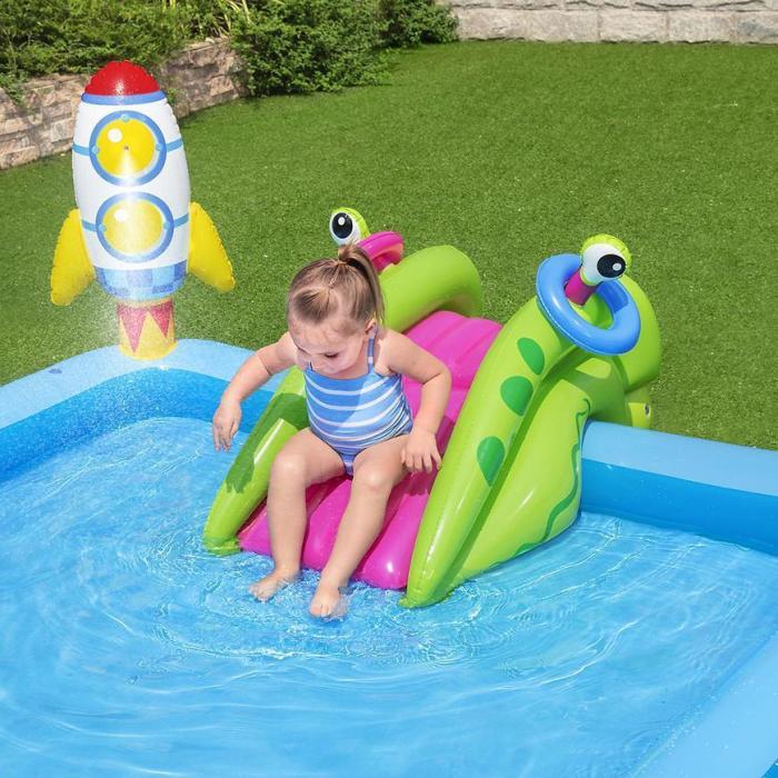 Nadmuchiwany plac zabaw kosmos o wymiarach 228x206x84 cm to świetna atrakcja dla dzieci i podczas letnich zabaw w ogrodzie. Wystarczy nalać wody i mamy centrum zabawy dla dzieci. Statek rakietowy to efekt chłodzącej wbudowanej mgły wodnej, Wystarczy podłączyć wąż ogrodowy, aby poczuć kojącą ulgę od gorąca i rozpocząć zabawę. Pojemność to 3008 litrów, a plac zawiera jeden basen, jeden bopbag, jedną księżycową grę w rzut do celu, jedno frisbee ziemne, jedno frisbee planety, cztery obręcze, łatkę naprawczą.