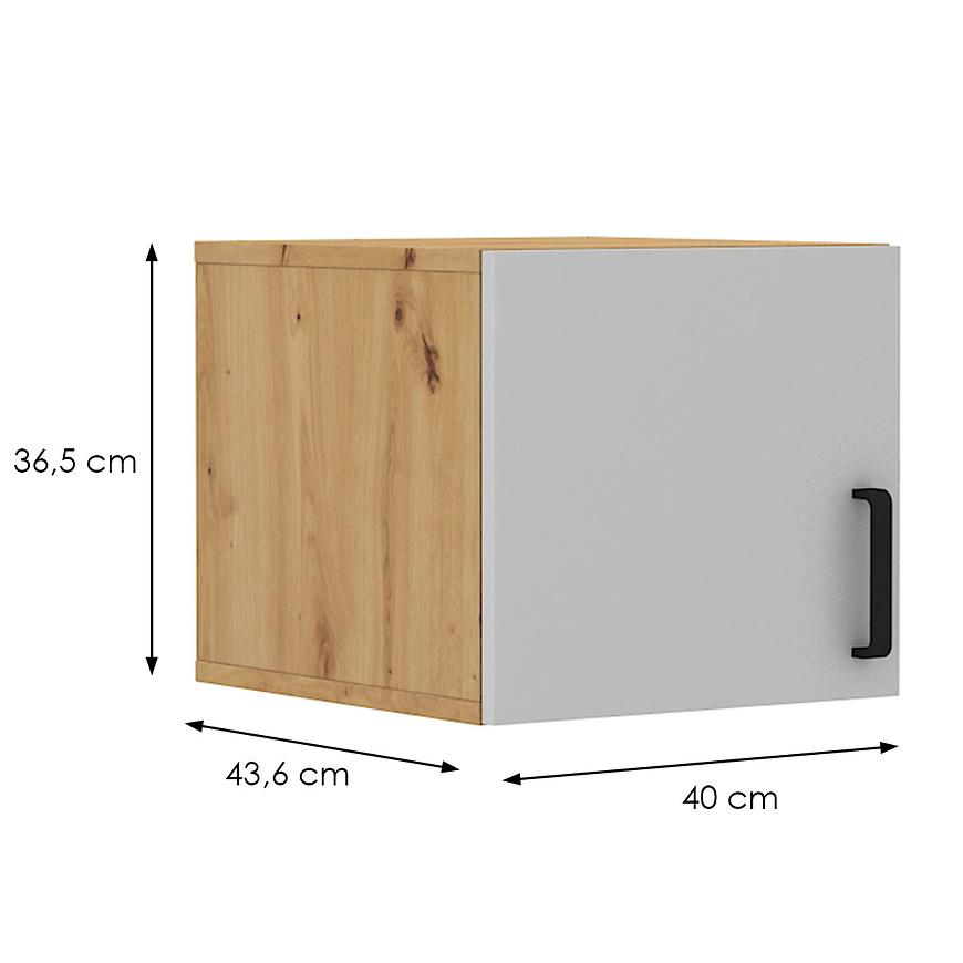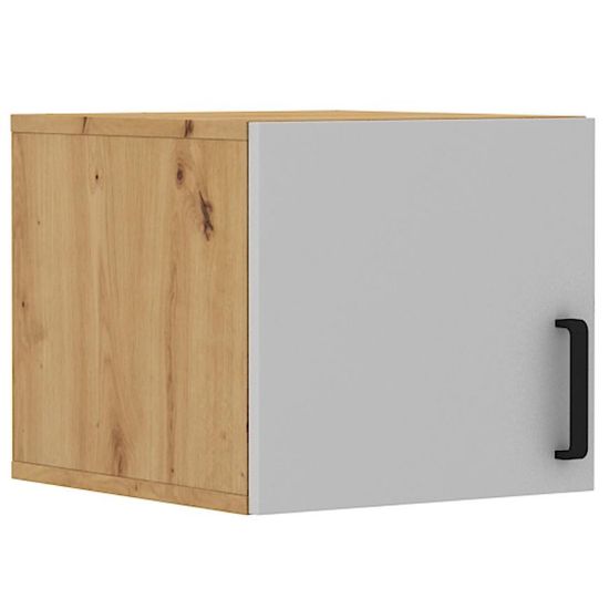 Jasne fronty świetnie kontrastują z ciepłym odcieniem korpusu. Ten naturalny odcień dąb artisan dodaje elegancji i ciepła, sprawiając, że nadstawka staje się nie tylko praktycznym elementem, ale także designerskim dodatkiem do Twojej przestrzeni. Matowe wykończenie nadaje meblowi nowoczesnego wyglądu, jednocześnie podkreślając jego wysoką jakość. Konstrukcja opiera się na solidnej płycie wiórowej laminowanej, co zapewnia trwałość i stabilność nadstawki. Jednodrzwiowy design sprawia, że z łatwością dostaniesz się do przechowywanej zawartości, a jednocześnie nadstawka nie zajmuje zbyt dużo miejsca.