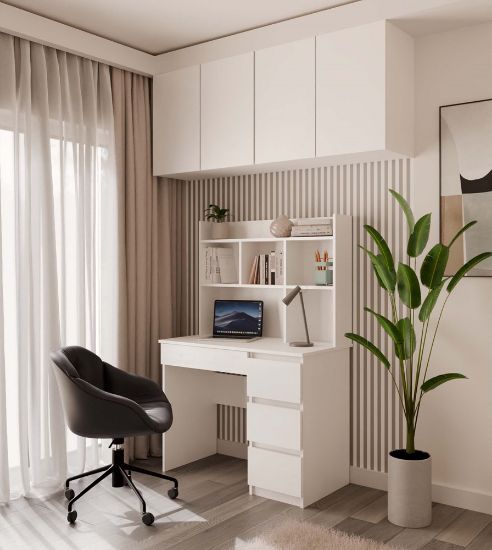 Nadstawka do biurka o szerokości 100 cm w kolorze białym to idealne uzupełnienie stanowiska pracy lub nauki, stworzone z myślą o osobach ceniących porządek, ergonomię i estetykę. Dzięki praktycznemu projektowi, oferuje 4 pojemne półki, które znakomicie sprawdzą się do przechowywania książek, dokumentów, artykułów biurowych czy dekoracji, zwiększając funkcjonalność każdego biurka.