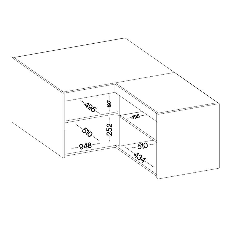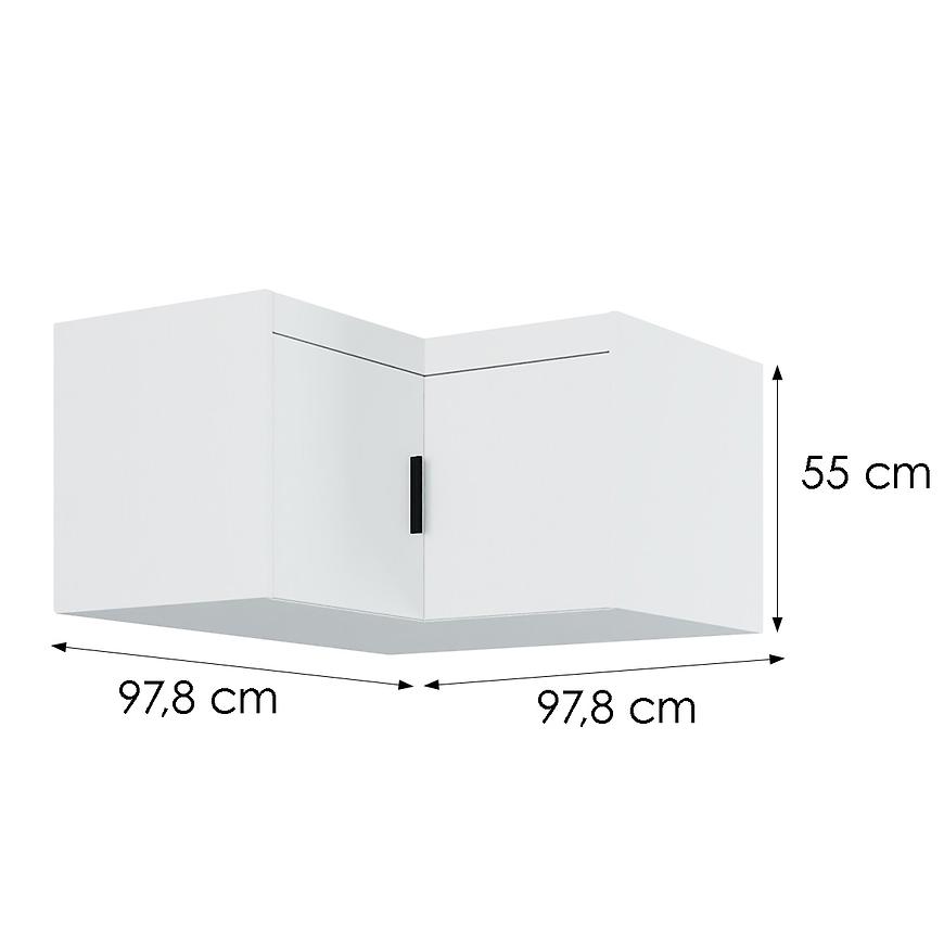 Narożna konstrukcja nadstawki to jej kluczowy atut – idealnie wypełnia trudne do zagospodarowania miejsca, wykorzystując narożniki w sposób praktyczny i estetyczny. Wewnątrz mebla znajduje się dodatkowa półka, która umożliwia uporządkowanie przedmiotów, dzięki czemu zyskujemy łatwy dostęp do rzadziej używanych rzeczy. To doskonałe rozwiązanie, które pozwala na zwiększenie przestrzeni przechowywania bez konieczności zajmowania dodatkowego miejsca na podłodze.
