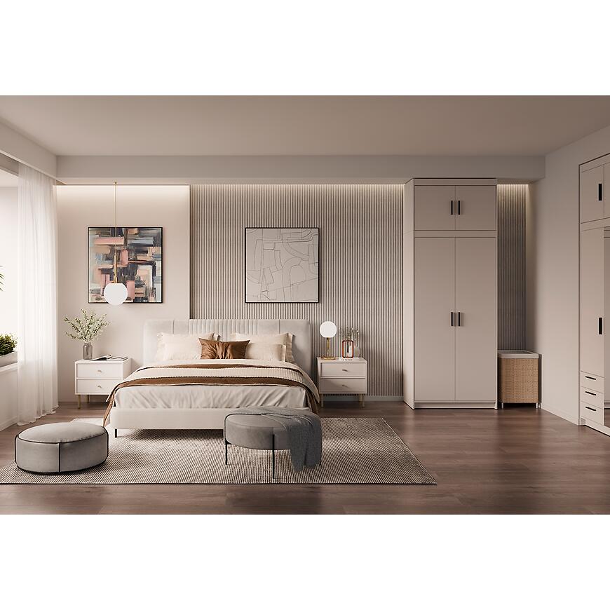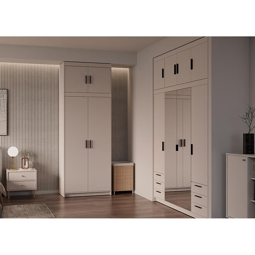 Fronty i korpus w kolorze beż piaskowy tworzą spokojną, neutralną bazę aranżacyjną, która dobrze współgra z jasnymi i ciemniejszymi dodatkami. Matowe wykończenie zarówno frontów, jak i korpusu ogranicza odbijanie światła i podkreśla nowoczesny charakter nadstawki meblowej. Beż piaskowy to kolor chętnie wybierany do wnętrz, w których liczy się wrażenie ładu, ciepła i wizualnej lekkości, dlatego nadstawka Elena 2D sprawdzi się w wielu stylach aranżacyjnych.