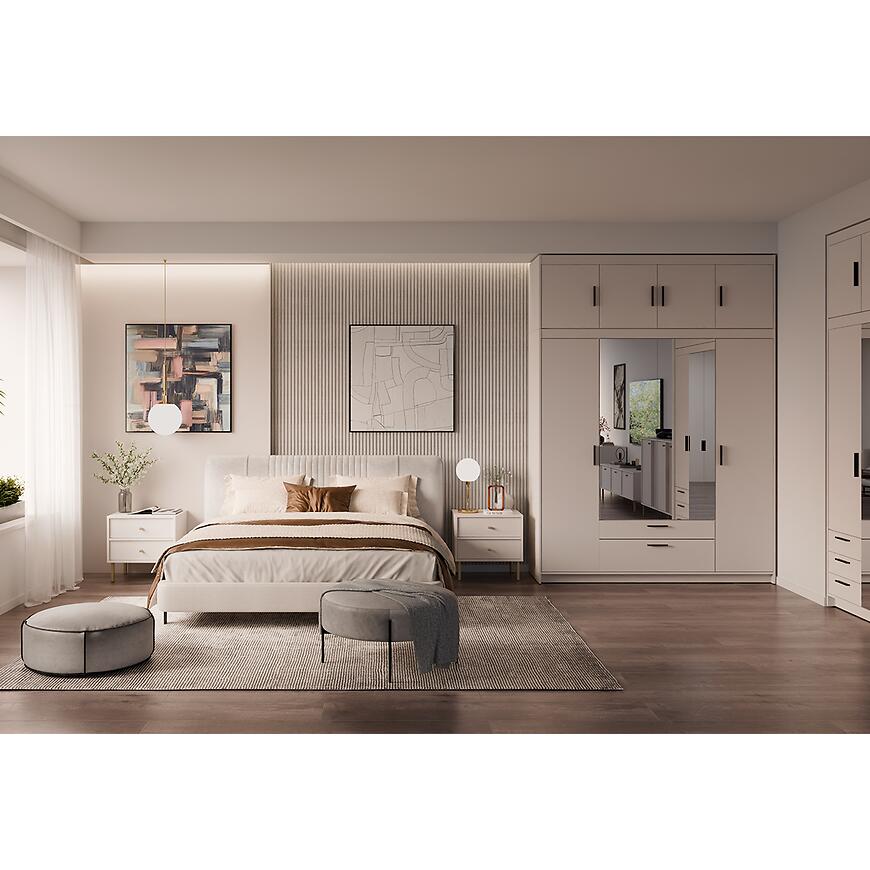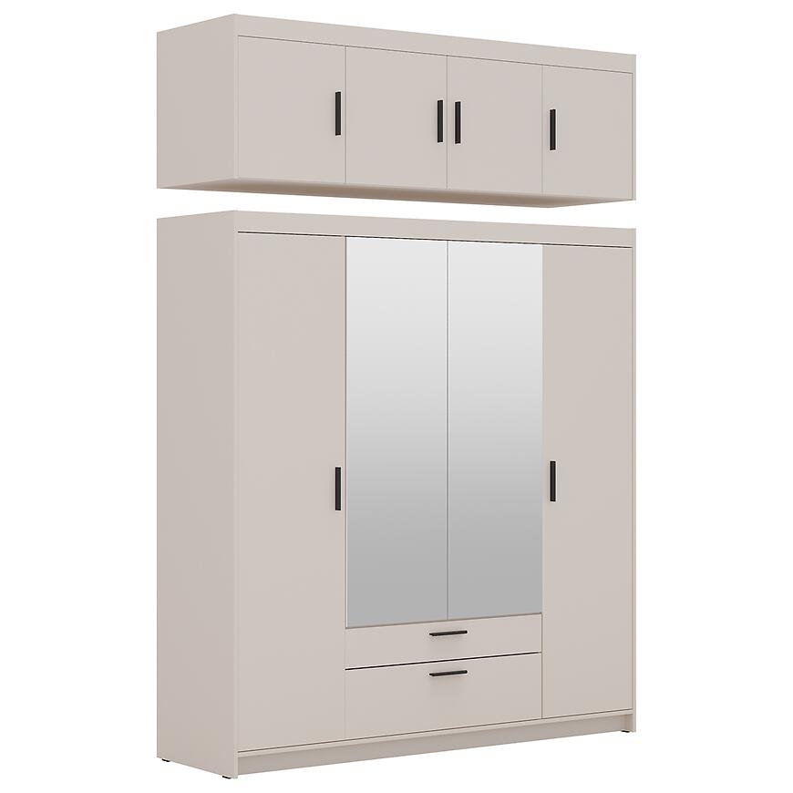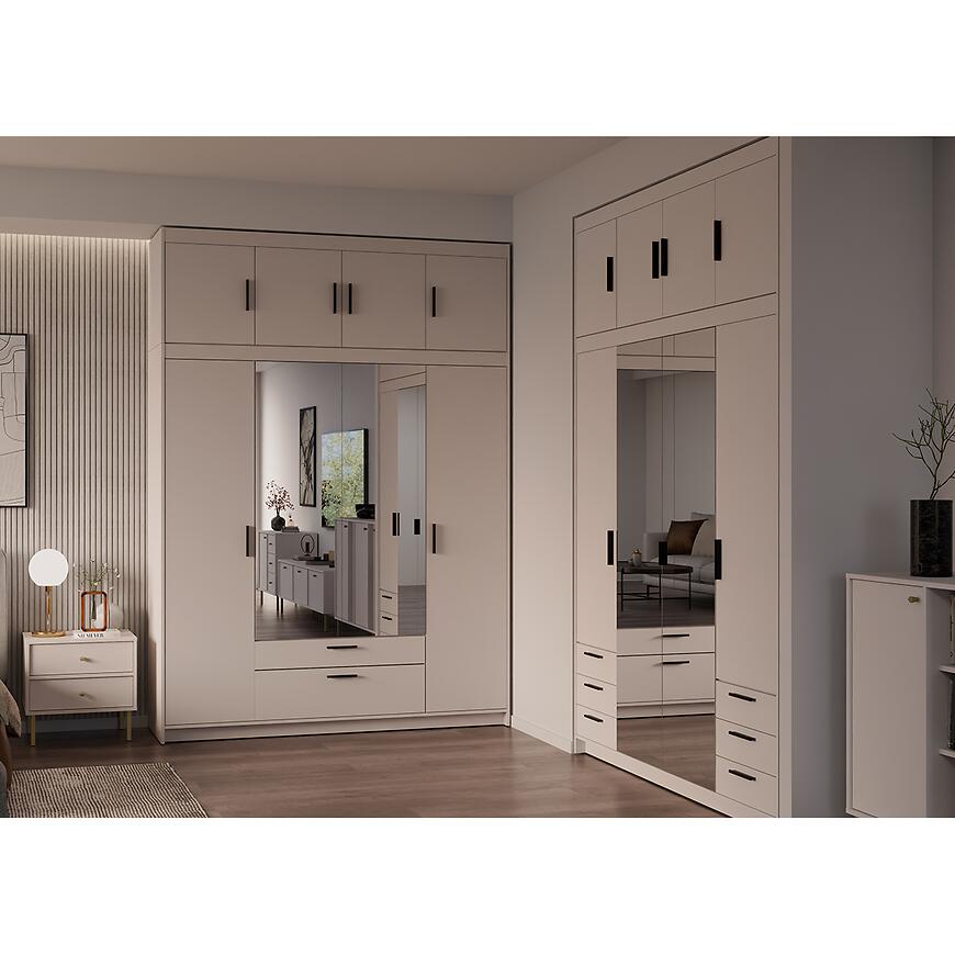 Fronty i korpus w kolorze beż piaskowy tworzą spokojną, neutralną bazę aranżacyjną, która dobrze współgra z jasnymi i ciemniejszymi dodatkami. Matowe wykończenie zarówno frontów, jak i korpusu ogranicza odbijanie światła i podkreśla nowoczesny charakter nadstawki meblowej. Beż piaskowy to kolor chętnie wybierany do wnętrz, w których liczy się wrażenie ładu, ciepła i wizualnej lekkości, dlatego nadstawka Elena 4D sprawdzi się w wielu stylach aranżacyjnych.