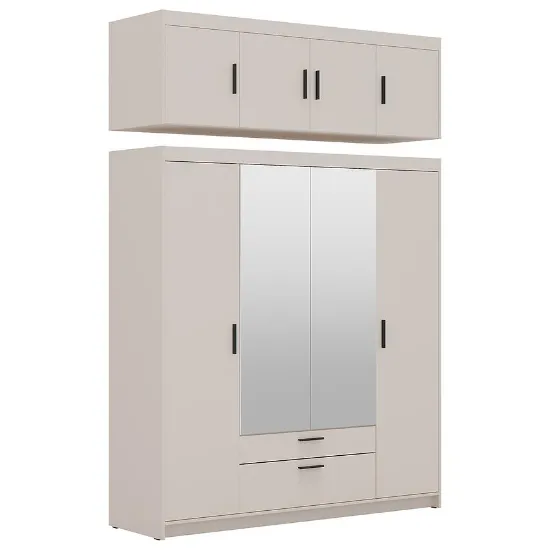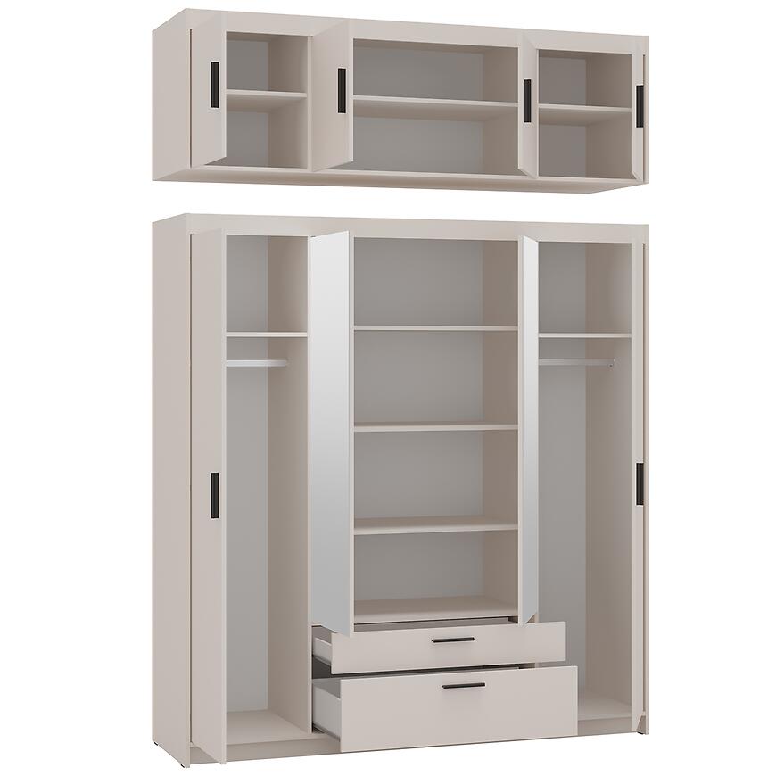 Wyposażenie nadstawki Elena 4D obejmuje praktyczne półki, które umożliwiają uporządkowanie dokumentów, zastawy stołowej, książek lub dekoracji. Brak oświetlenia sprawia, że forma pozostaje minimalistyczna, a mebel nie dominuje wizualnie nad pozostałymi elementami wyposażenia. To dobre rozwiązanie dla osób, które cenią prostotę i możliwość samodzielnego doboru dodatkowych źródeł światła w pomieszczeniu.