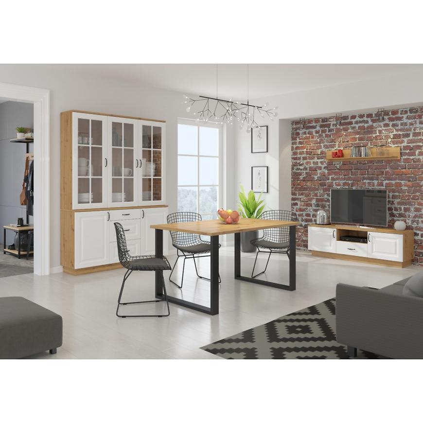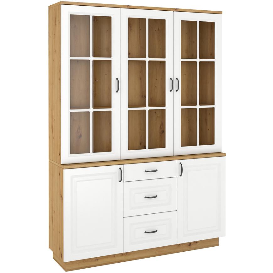 Nadstawkę cechuje znaczna szerokość wynosząca 150 cm, co pozwala na ekspozycję i przechowywanie różnorodnych przedmiotów. Wysokość 126 cm oraz głębokość 34 cm sprawiają, że nadstawka jest proporcjonalna i elegancka, idealna do wielu aranżacji. Fronty w pięknym białym kolorze harmonizują z korpusem wykonanym z dębu artisan, co nadaje meblowi unikalny wygląd. Matowe wykończenie frontów dodaje elegancji, a matowe wykończenie korpusu podkreśla trwałość konstrukcji.